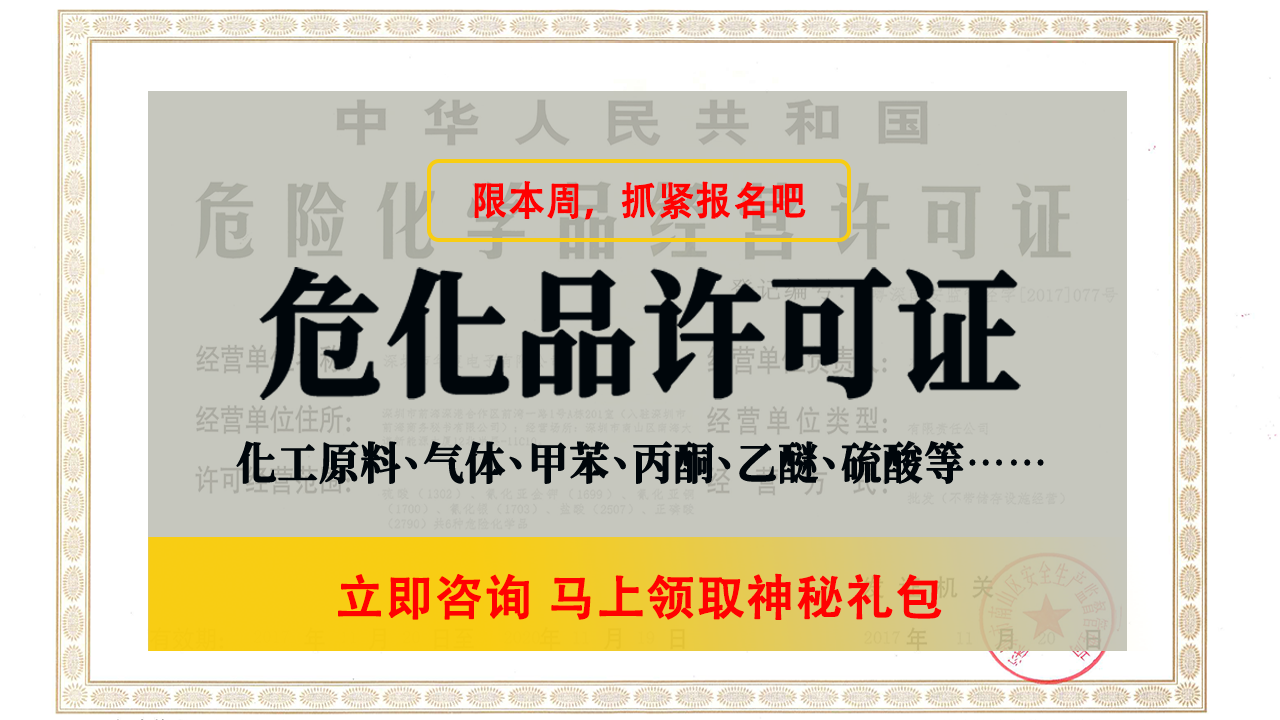 危險(xiǎn)化學(xué)品無論是在日常生活還是相關(guān)的行業(yè)當(dāng)中,都有著不可替代的位置,因此導(dǎo)致很多人都想要經(jīng)營危險(xiǎn)化學(xué)品。但是想要經(jīng)營危險(xiǎn)化學(xué)品首先需要獲得危險(xiǎn)化學(xué)品經(jīng)營許可證,那么,在東莞危險(xiǎn)化學(xué)品經(jīng)營許可證在哪里辦呢?又是如何辦理的呢?下面匯域國際小編就來為您詳細(xì)介紹: